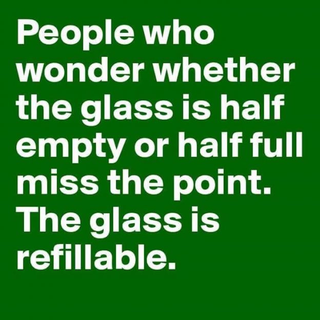 We’ve all heard the sayings and whether a pessimist or an optimist is denoted. “The glass is half full,” says the optimist. “The glass is half empty,” says the pessimist. “The glass is improperly engineered,” says the engineer. “While you all argued about it, I drank it and now it’s empty,” says the opportunist. Here’s what someone says who believes in a positive and motivated outlook: “The glass is refillable. Partake all you want.”